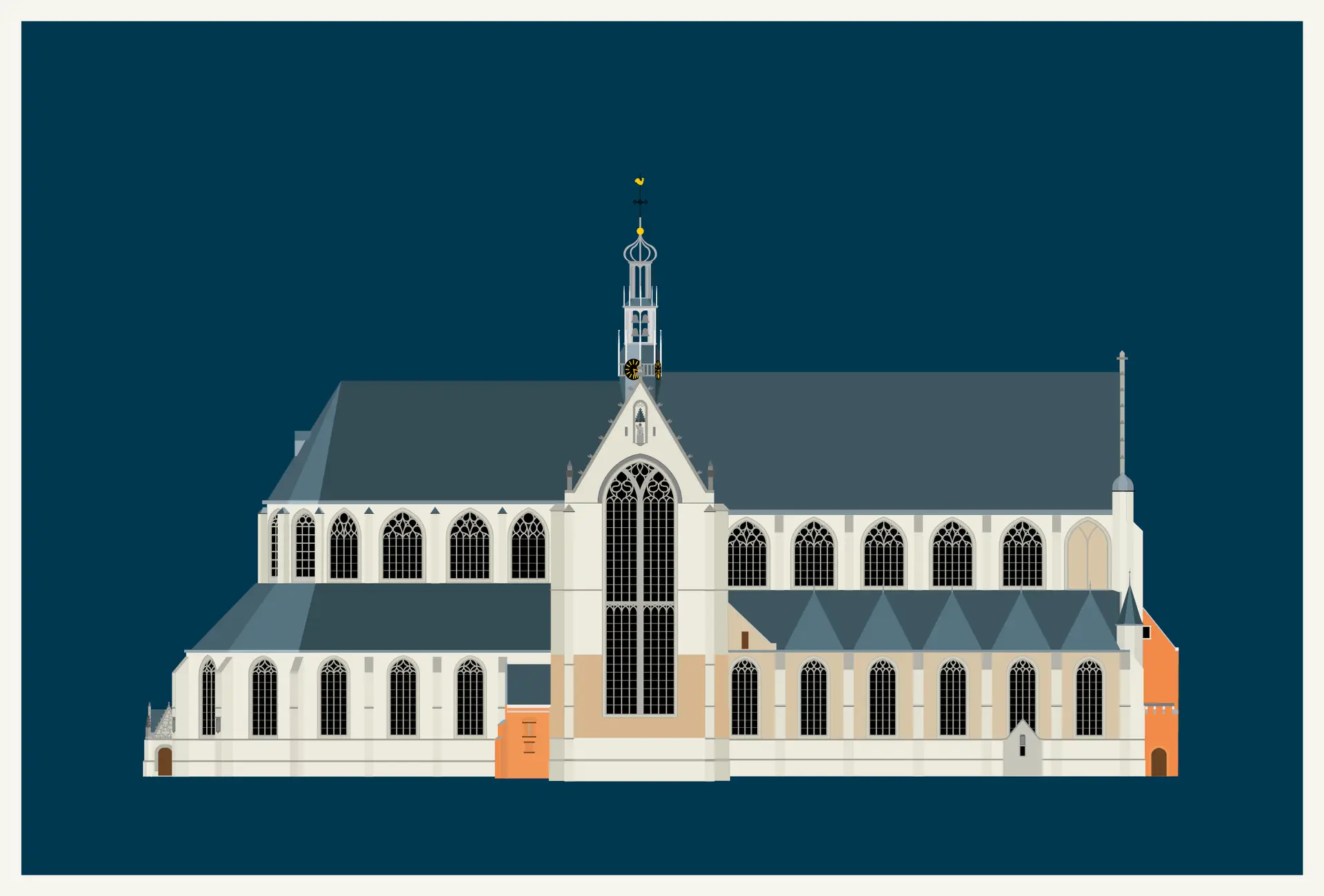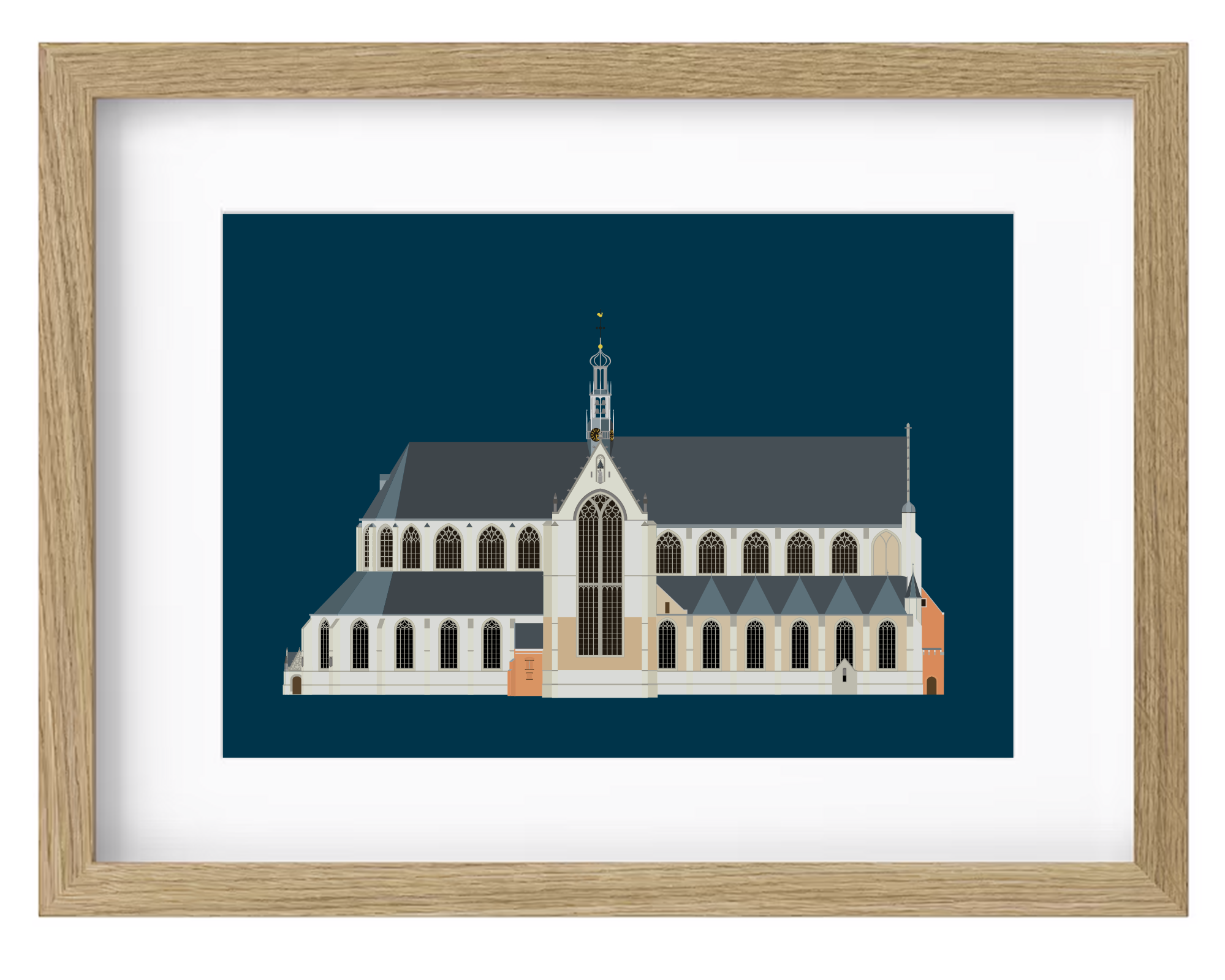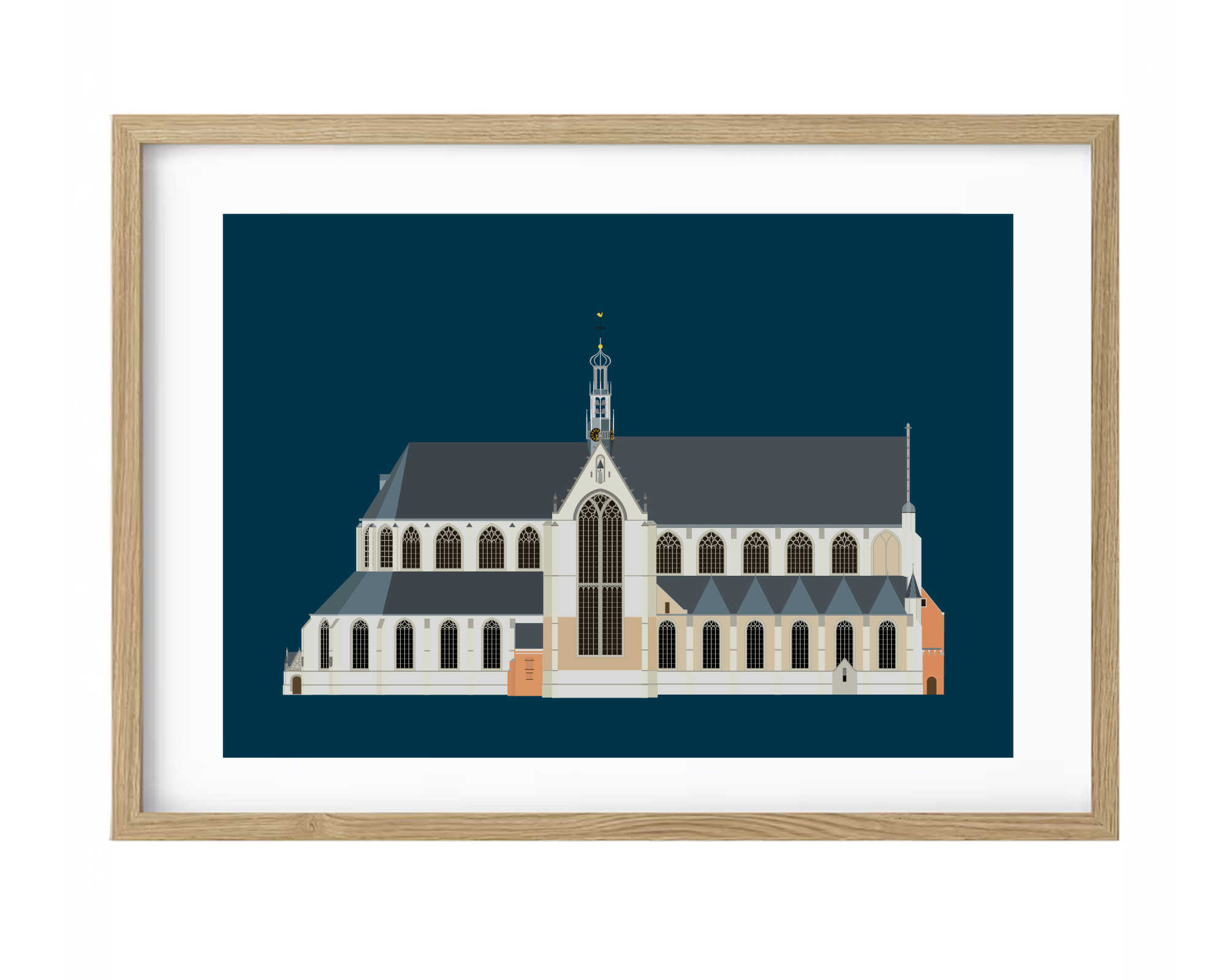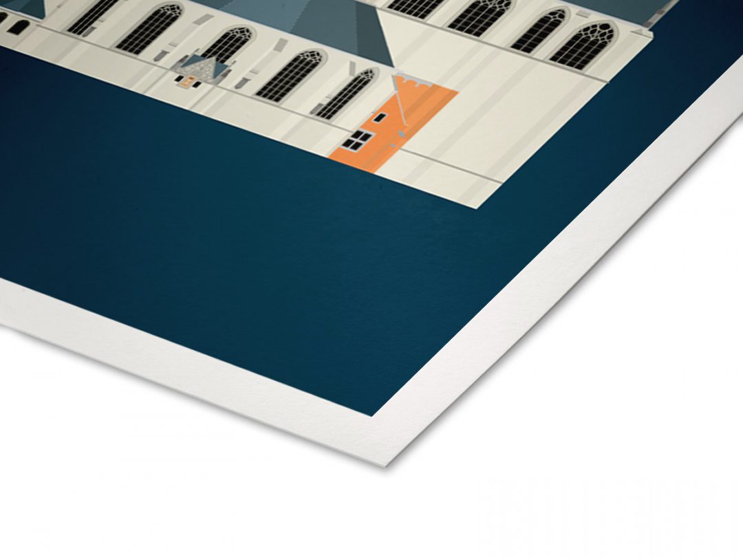Print van de Grote Sint Laurenskerk in Alkmaar gezien vanaf het Canadaplein op Hahnemühle Hemp® museumkwaliteit papier. Om de afbeelding zit een witrand van 1 cm. Door de extra witrand is de foto makkelijker in te lijsten zonder dat er beeld wegvalt achter bijvoorbeeld een passepartout. Een print met een afbeelding van 30 x 20 cm is dan totaal 32 x 22 cm groot.